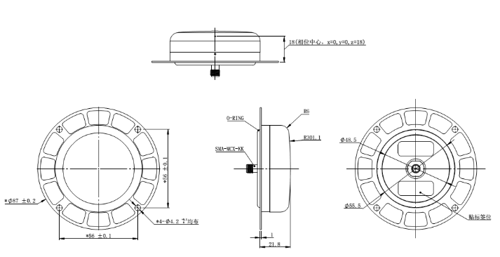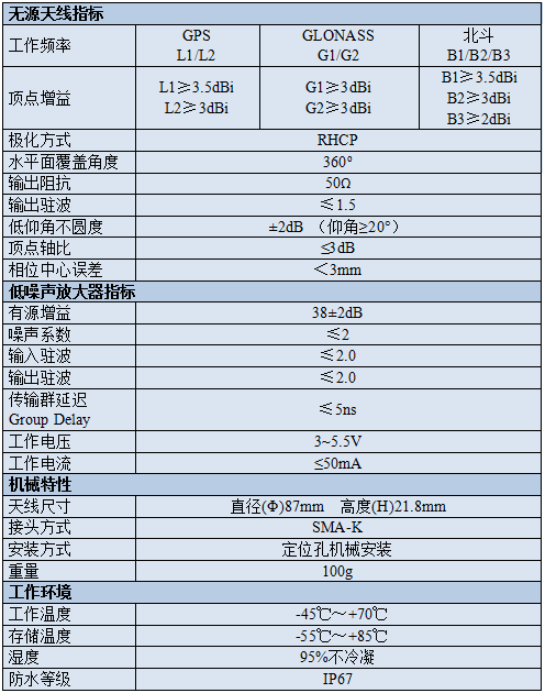 该类天线可以同时接收GPSL1L2、GLONASSG1G2和北斗B1B2B3频段的信号,可与国内外主流板卡完美匹配,即插即用,特别适用于无人机的高精度定位定向领域。