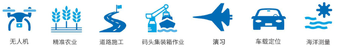 航天航空、精准农业、车载定位、道路施工、海洋测量、码头集装箱作业、演习、边防警戒等。