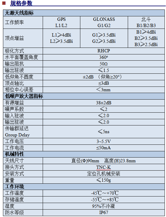 该天线可以同时接收GPS L1L2、GLONASS G1G2和北斗B1B2B3频段的信号,可与国内外主流板卡完美匹配,即插即用。 广泛应用于航空航天、精准农业、车载定位等场合,特别适用于无人机的高精度定位定向领域。