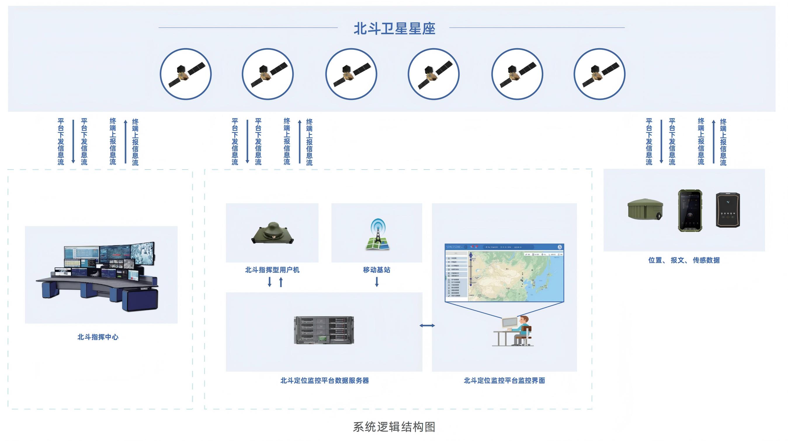 系统采用多级联动,由现场端和指挥中心组成。现场端的北斗手持终端通过北斗卫星这条新的通信链路发送到局端的接收设备,实现与北斗指挥中心之间的数据透传。北斗指挥中心收到北斗报文之后,通过北斗通信前置服务器的软件解析并将数据传送至应急管理中心业务系统,以便于北斗指挥中心指定相应的应急救援方案。
